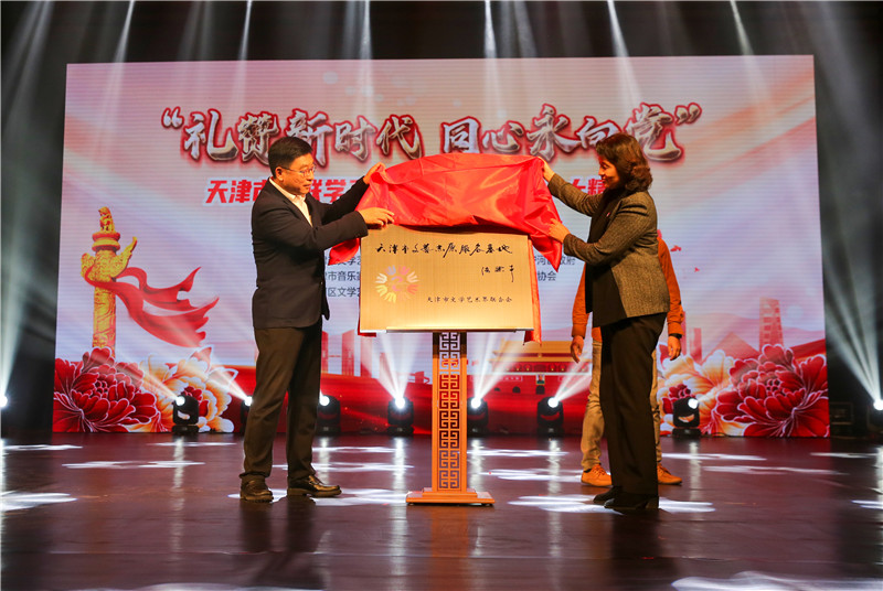 天津市文联党组书记、专职副主席万镜明与宁河区委书记白凤祥共同为宁河“天津市文艺志愿服务基地”揭牌 连日来,市文联迅速组织全市文艺界认真学习宣传贯彻党的二十大精神,同时引导鼓励文艺工作者围绕党的二十大精神主题开展艺术创作。本场活动由市文联、宁河区委、宁河区政府主办,市音协、市舞协、市曲协、宁河区文联承办,我市老中青三代艺术家带来曲艺、音乐、舞蹈节目及美术、书法作品,以艺术形式向宁河区基层干部宣传党的二十大精神。