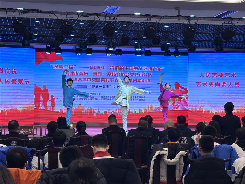 为深入学习贯彻党的二十大精神和习近平文化思想,贯彻落实中央和市委关于新时代文明实践中心建设的部署要求,推动中国文联、中央文明办组织开展的“强基工程”——文艺助力基层精神文明建设行动在天津落实见效。2024年1月9日,由市音协、市舞协、市杂协组成的天津市文联文艺惠民服务小分队,在中国人民警察节到来之际走进天津市交管局和平支队、小白楼街道“警民一家亲”文艺惠民演出在天津市和平文化宫成功举办。市文联党组书记、专职副主席赵华,市公安局交警总队副总队长牛健,和平区政法委副书记于克强出席,交管局和平支队干警、小白楼街道社区居民百余人观看了演出。