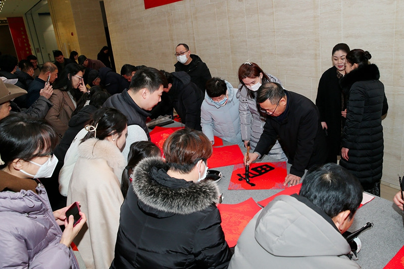 在滨海文化中心活动现场,翰墨飘香,气氛热烈,年味十足。书法家们精神饱满,挥毫泼墨,神采飞扬,书写的一幅幅饱含深情的“福”字和春联,为群众送上了浓浓的节日祝福。200余名群众接过“福”字和对联,纷纷与书法家们合影留念,活动现场洋溢着红火喜庆的氛围。