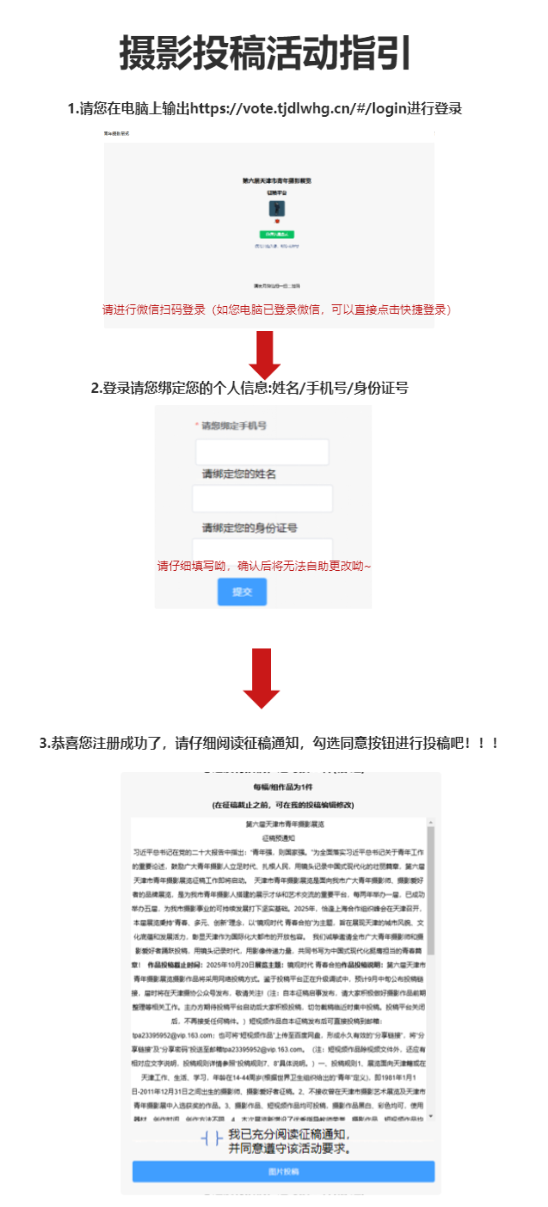 为鼓励广大青年摄影人立足时代、扎根人民,用镜头记录中国式现代化的壮丽篇章,第六届天津市青年摄影展览征稿工作正式启动。 天津市青年摄影展览是面向我市广大青年摄影师、摄影爱好者的品牌展览,是为我市青年摄影人搭建的展示才华和艺术交流的重要平台,每两年举办一届,已成功举办五届,为我市摄影事业的可持续发展打下坚实基础。 2025年,恰逢上海合作组织峰会在天津召开,本届展览秉持“青春、多元、创新”理念,以“镜观时代 青春合拍”为主题,旨在展现天津的城市风貌、文化底蕴和发展活力,彰显天津作为国际化大都市的开放包容。 我们诚挚邀请全市广大青年摄影师和摄影爱好者踊跃投稿,用镜头记录时代,用影像传递力量,共同书写为中国式现代化挺膺担当的青春篇章! 主办单位: 天津市文学艺术界联合会 承办单位: 天津市摄影家协会 东丽区文化旅游体育局 执行承办: 协办单位: 天津市高校摄影学会 天津市摄影家协会各团体会员单位 天津市河西区文化馆 亨昌瑞祥(天津)商贸有限公司 作品投稿截止时间: 2025年10月20日 展览主题: 镜观时代 青春合拍 作品投稿说明: 第六届天津市青年摄影展览摄影作品采用网络投稿方式。投稿平台:https://vote.tjdlwhg.cn/#/login(点击文章左下角“阅读原文”进入) ![]() 短视频作品自本征稿发布后可直接投稿到邮箱:tpa23395952@vip.163.com;也可将“短视频作品”上传至百度网盘,形成永久有效的“分享链接”,将“分享链接”及“分享密码”投送至邮箱tpa23395952@vip.163.com。 (注:短视频作品除视频文件外,还应有相对应文字说明,投稿规则详情参照“投稿规则7、8”具体说明。) 一、投稿规则 1.展览面向天津籍或在天津工作、生活、学习,年龄在14-44周岁(根据世界卫生组织给出的“青年”定义),即1981年1月1日-2011年12月31日之间出生的摄影师、摄影爱好者征稿。 2.不接收曾在天津市摄影艺术展览及天津市青年摄影展中入选获奖的作品。 3.摄影作品、短视频作品均可投稿,摄影作品黑白、彩色均可,使用器材、创作时间、创作方法不限。 4.本次展览新增设了优秀指导教师荣誉。摄影作品、短视频作品均可增加1名指导教师。(详情见:8、作品命名方式) 5.电子文件报送,摄影作品为jpg格式,单幅文件量须在5 MB以上。每件作品须有唯一的标题,不接受“未标题”或“无题”作品。 6.摄影作品,每位作者投稿不超过10件(组照为一件,每组限定为4-12幅)。 7.短视频作品,每位作者投稿不超过5件,每件时长5分钟以内(超过5分钟不予评审,主创人员不得超过4人):采用MP4格式,720P或更高分辨率;大小不超过2G。 8.作品命名方式: 单幅、组照作品按照“投稿平台”具体要求投稿,涉及作者信息、作品信息(题目、拍摄时间、地点、拍摄要点等)。 短视频作品:统一采用“作者姓名+作品题目+联系电话+身份证号+指导教师姓名(如无指导教师可不填最后一项)”并附简要作品说明(200字以内,包括拍摄时间、地点、拍摄要点),作品说明用TXT(推荐)或Word文本格式,说明文件题目须与照片题目相同。作者将报送的所有作品(含短视频说明)打包压缩成一个文件夹发到指定邮箱(百度云盘),压缩包文件夹命名方式:作者姓名+联系电话+身份证号。 9.为避免重复投稿造成的数据混乱,切勿重复投稿。 10.报送的作品不得添加任何装饰和水印标识。 11.短视频作品画面中须有作品题目。 二、荣誉设置 1.“第六届天津市青年摄影展优秀摄影师”10名,颁发奖杯、证书、作品集。 2.“第六届天津市青年摄影展优秀指导教师”若干名,颁发证书。 3.入选作品共计100件,颁发证书及作品集。 4.入选作者可凭入选证书累积天津市摄影家协会入会申请积分,在职学校教师如为指导教师,凭“指导教师”证书可作为参考条件。
