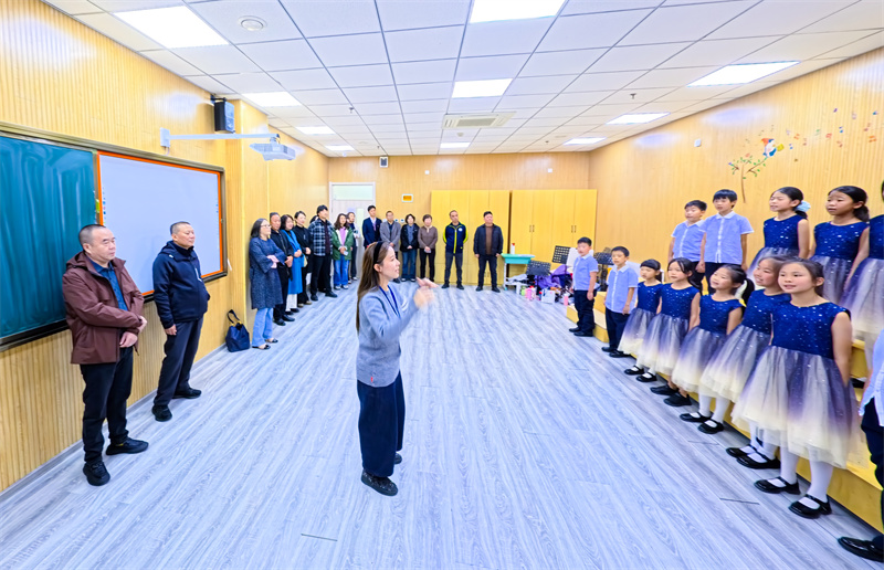 在合唱表演点评环节,天津音乐学院合唱指挥专业教授、天津市音乐家协会合唱专委会主任刘巍与合唱专委会副秘书长宋婕老师联袂指导。刘巍教授从合唱的声部和谐、气息配合等专业角度出发,指出表演中的亮点与不足,通过分组练习、声部磨合等现场训练,帮助孩子们提升合唱的整体性与表现力;宋婕老师则关注孩子们的情感传递,鼓励大家用饱满的热情投入演唱,让歌声更具感染力。天津音乐学院作曲指挥系教师、天津市第十二届文艺新星时昊也从选曲、节奏适配等方面提出专业建议,为学生艺术团的节目打磨提供了新思路。