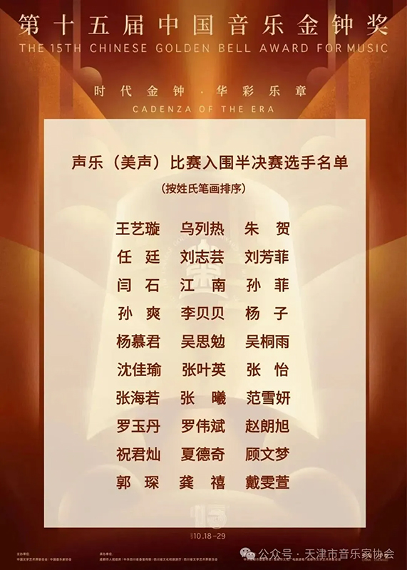 10月20日,第十五届中国音乐金钟奖表演奖决赛阶段(复赛、半决赛、决赛)赛事在四川省成都市拉开帷幕,由天津市音乐家协会推荐的声乐(美声)选手郭琛,在全国85位晋级复赛选手中脱颖而出成功晋级半决赛。中国音乐金钟奖是由中宣部批准设立、中国文联和中国音乐家协会共同主办的音乐类奖项,是最具权威性、导向性和引领性的国家级音乐综合性艺术大奖,代表着中国音乐最高水准。天津市文联,天津市音乐家协会高度重视本次赛事,邀请到众多全国著名音乐家担任天津市选拔赛评委,并广泛动员在全国各地天津籍、天津工作的音乐表演者参与其中。