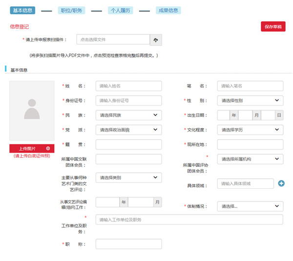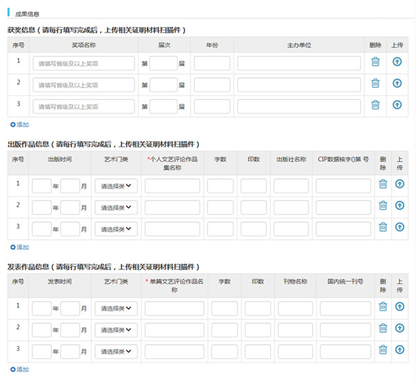 ![]() 3. 请在成果信息处上传相关证明材料清晰扫描件,保证内容可读。要求如下: (1)获奖信息:请上传省级以上文艺奖项获奖证书扫描件; (2)出版作品:请对照申请条件上传出版作品的封面、版权页、目录页及内文主要页面扫描件。申报作品均须经中国版本图书馆查询核实为国家合法出版物,自费或合作出书情况,应作出说明,以供参考,非法出版物为无效材料; (3)发表作品:请对照申请条件提供在全国公开发行期刊或报纸上发表的作品。请上传作品发表当期刊物封面(或当日报纸版头)、目录页及作品页扫描件;网络文艺评论作品请上传首页的网页截图,须含网站名称或网址、发表时间、作品阅读量,网络发表作品须符合《著作权法》和相关法律法规; (4)职称证书:请上传相应职称证书;各全国文艺家协会会员证;全国文艺评论方面的研修培训结业证;申请者所在单位出具的关于申请者文艺评论工作年限满足入会条件的证明;统战部门出具的无党派人士证明等材料扫描件; (5)身份证:请上传身份证件正反面扫描件; 4. 系统填写完成后点击“下载申请表”导出并打印,在打印的申请表上依次完成本人签字、本人所在单位签署意见并盖章、推荐单位签署意见并盖章或推荐人签署意见并签字,三者缺一不可,否则视为申请手续不全不予审批; 5. 请将盖章、签字手续齐备的申请表扫描件上传至系统; 6. 经检查所有信息填写完整无误,入会申请表、获奖证书、出版或发表作品材料、职称证书、身份证件等扫描件均上传后,点击“提交”; 7. 提交成功后将显示“已提交到中国评协,等待审核!”,请申请者耐心等待; 8. 中国文艺评论家协会按照程序严格组织评审,并将新会员名单适时在中国文艺评论网和中国文艺评论微信公众号上发布; 9. 中国文艺评论家协会发放的新会员通知,将由各省级评协通知到该地区的全部新会员,待收齐会费后,中国评协将为该地区会员统一办理会员证,并由各省级评协代为寄送至会员本人;中央和国家机关单位的新会员,由中国评协秘书处直接联系办理; 10. 在成为新会员后,如个人信息有变更,请及时主动告知中国评协和所在地区省级评协。信息变更涉及会员本人权益,特别是电话号码、通讯地址、邮编、单位及职务职称等信息变动较为常见,请及时联系更新。 四、其他有关事项 所填报信息及申报作品须真实有效,有弄虚作假、抄袭、剽窃行为的申请者,中国文艺评论家协会将取消其五年内的申请资格; 本办法仅适用于内地申请者,香港、澳门、台湾地区及海外申请者另作规定; 成为正式会员需按时交纳会费,我会会费标准为每年120元。 五、联系方式 (请于周一至周五工作日、工作时间拨打,上午9:00—11:00,下午2:30—4:30。) 入会申报系统技术支持咨询电话: 010-64920183 中国文艺评论家协会秘书处联系电话: 010-59759456
