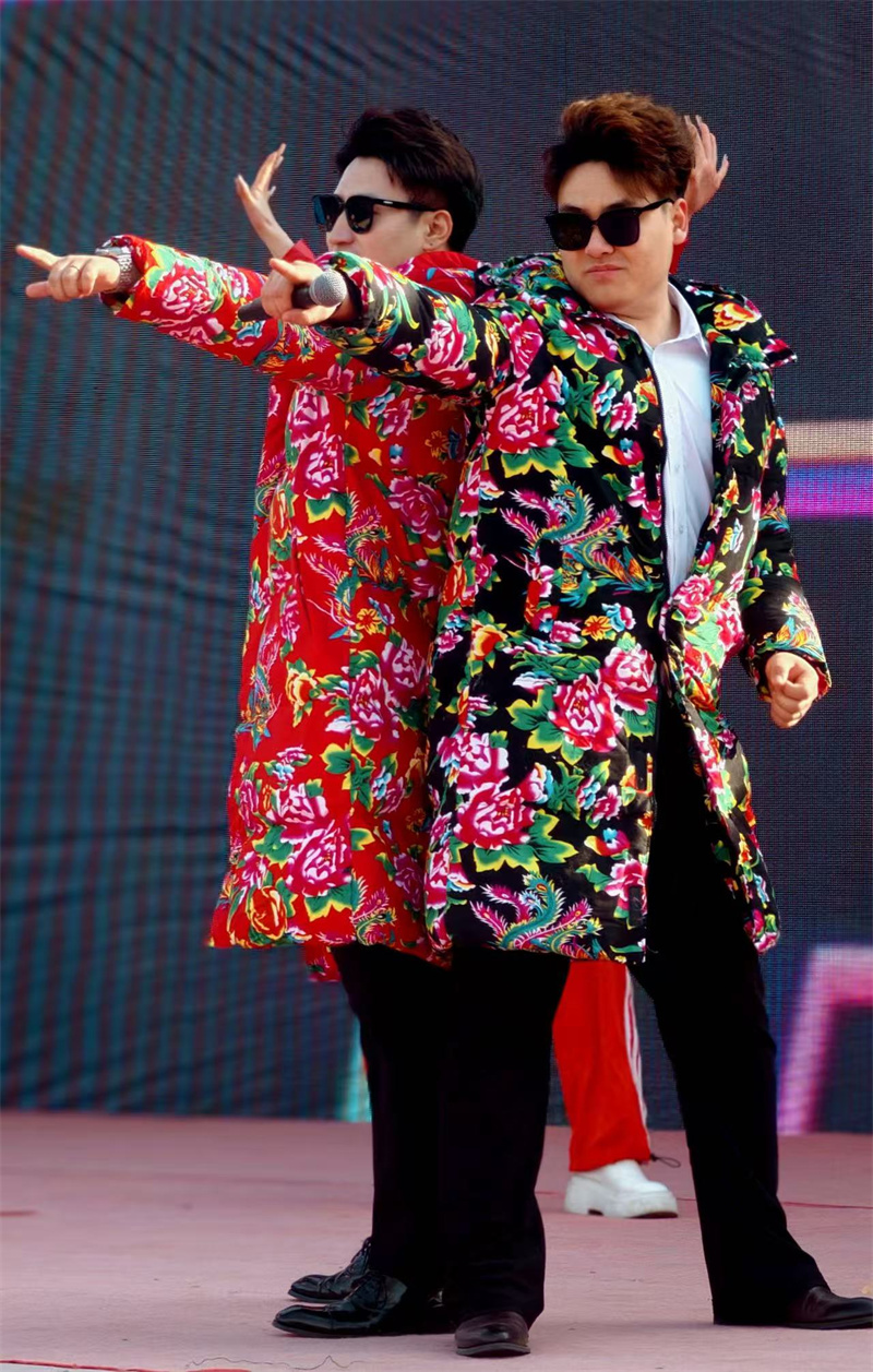 演出在歌伴舞《迎盛世举金杯》的喜庆旋律中拉开帷幕,大气磅礴的舞姿与嘹亮动听的歌声瞬间点燃现场氛围。随后,活力四射的男声组合演唱《最炫民族风》,搭配M舞团的动感伴舞,节奏明快、感染力十足,赢得观众阵阵掌声;非遗变脸表演轮番上演绝活,演员举手投足间变幻莫测,让现场群众近距离领略传统艺术的独特魅力,喝彩声此起彼伏。