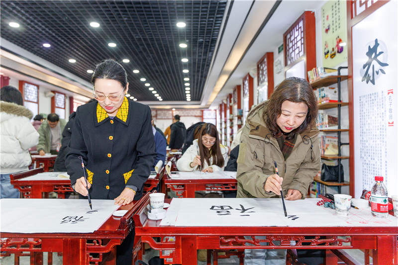现场还设置了书法互动环节,笔墨纸砚齐备,文艺爱好者纷纷提笔书写,在老师的指导下完成属于自己的作品,沉浸式体验传统文化的静美与力量。