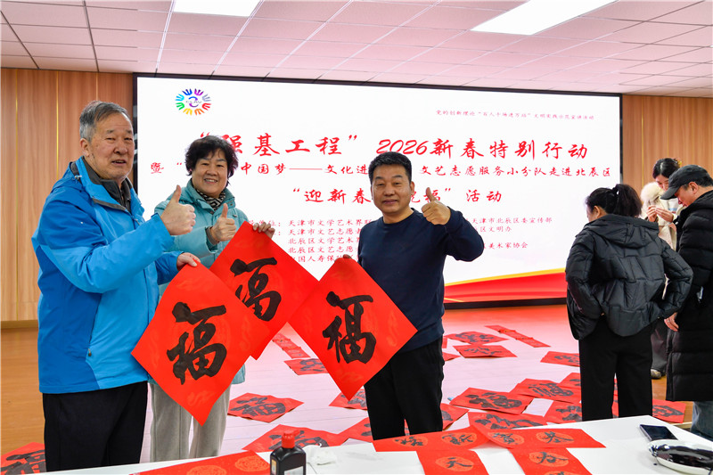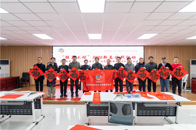 翰墨飘香添喜气,红联送福暖民心。2026年1月26日上午,由天津市文学艺术界联合会、天津市文明办、北辰区委宣传部指导,天津市文艺志愿者协会、天津市书法家协会、北辰区文学艺术界联合会等单位联合承办的“强基工程”2026新春特别行动暨“我们的中国梦——文化进万家”文艺志愿服务小分队走进北辰区“迎新春 送祝福”活动,在北辰区新时代文明实践综合体热闹启幕。 ![]() 出席活动的有市文联秘书长张建鹏,北辰区委常委、区委宣传部部长贾春宁,市书协原副主席、北辰区书协主席沈宪民,市书协副主席、西青区书协主席杨国欣,市书协理事王劼、杨占良,市书协草书委员会委员李梅军及区书协、美协书画家。 ![]() ![]() ![]() ![]() ![]() ![]() ![]() 文化惠民,书写时代新风。现场,来自市书协、北辰区书协、美协的文艺志愿者们化身“文艺轻骑兵”,在鲜红的春联纸上挥毫泼墨,行、草、隶、篆各体兼备,“福满北辰春满园”“文明新风传万家”等寓意吉祥的春联与“福”字跃然纸上。 活动现场,数十位社区居民有序领取春联,老人孩子手持“福”字笑逐颜开,笔墨间流淌着对新春的期盼,更彰显了文化惠民的温度与力量。 ![]() 此次活动以文艺志愿服务的形式,推动“强基工程”与“文化进万家”活动走深走实,为北辰群众送上了看得见、摸得着的“文化年货”,为新春佳节增添了浓厚的文化氛围,让文明新风尚在墨香与祝福中浸润人心。 |