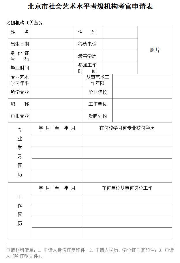 各单位、团体、会员: 为进一步规范社会艺术考级,加强中国音乐家协会考级管理,天津市将开展2026年中国音协考级新考官申报工作,现将相关要求通知如下。 一、根据《全国社会艺术水平管理办法》关于考官申报要求和条件(附件1),请严格按照要求准备材料,并于2026年4月13日前将考官申请资料报送至天津市音协办公室。材料清单及要求详见附件2。 二、中国音协音乐考级委员会将对新报考官资料进行审核,审核后上报文化旅游部审批,审批通过发放《中国音乐家协会考级考官执考证书》。 三、各单位、团体和个人提供的所有考官资料必须真实有效,如发现资料造假行为,将永久取消其申报考官资格。 特此通知。 附件1:申报条件 附件2:新报考官材料清单及要求注意事项 附件3:2026年新报考官申请表 附件4:从业经历在职证明(模板仅供参考) 联系人:丁 珊 电 话:022-23305682 邮寄地址:天津市和平区新华路237号325室 天津市音乐家协会 2026年4月3日 附件1: 中国音乐家协会考级工作专家委员会 关于申报中国音乐家协会考级考官的条件 1.必须是中国音乐家协会入会2年以上会员。 2.具有7年以上所申请的专业音乐学习经历,或者中级以上(含中级)艺术或者艺术教育专业职称。专业音乐学习经历包括学历教育学习经历与非学历教育学习经历。 3.具有5年以上所申请专业的音乐或者音乐教育工作经历。 4.了解有关音乐考级政策、法规、文件,并能在实际工作中贯彻执行。 5.熟悉并掌握执考专业音乐考级教材和各级别标准。 6.具有扎实的音乐基础知识和丰富的艺术实践经验。 7.具有良好的示范、教学指导及鉴赏能力。 8.具有良好的政治素质、道德修养。 附件2: 新报考官材料清单及要求注意事项 一、纸质材料清单 1.考官申请表(附件3)。 2.中国音乐家协会会员证复印件(入会2年以上)。 3.学历复印件(本人艺术学习的所有学历,包括音乐学院附中、中专、大专、本科、硕士、博士等),并在学信网查询和打印本人的学历报告(请将查验码有效期设置为6个月)。 4.有效期内的职称证复印件。 5.有效期内的身份证复印件(正反面)。 6.从业经历在职证明(由申报人员所在单位人事部门出具,详细描述5年以上申报专业的工作经历,并盖申报人员所在单位公章),参考(附件4) 7.2寸彩色近期免冠照2张(一张贴申请表上,一张用照片袋装好附在材料上)。 二、注意事项 1.考官申请表电子版(附件3)内容需与纸质版完全一致;(一定不要在左上角考级机构盖章处盖章,此处是中国音协盖章的位置) 2.提供的证件都要加盖申报人员所在单位人事部门印章(红色鲜章)。 3.申请表中专业学习简历和工作简历必须如实填写,详细注明学习时间、工作时间,明确填写学习专业、从事专业。 4.提供专业学习经历的所有学历毕业证书复印件,学历证书需真实有效,与学信网信息一致。 5.国外毕业证需提供教育部核发的《国外学历学位认证书》。 6.根据文旅审批要求,今年的申报考官工作时间紧迫,请务必于2026年4月13日前报送,逾期报送将不予审核。 附件3:
